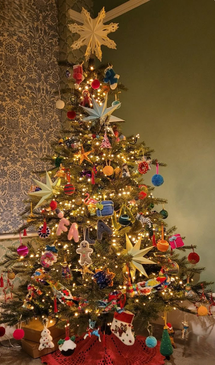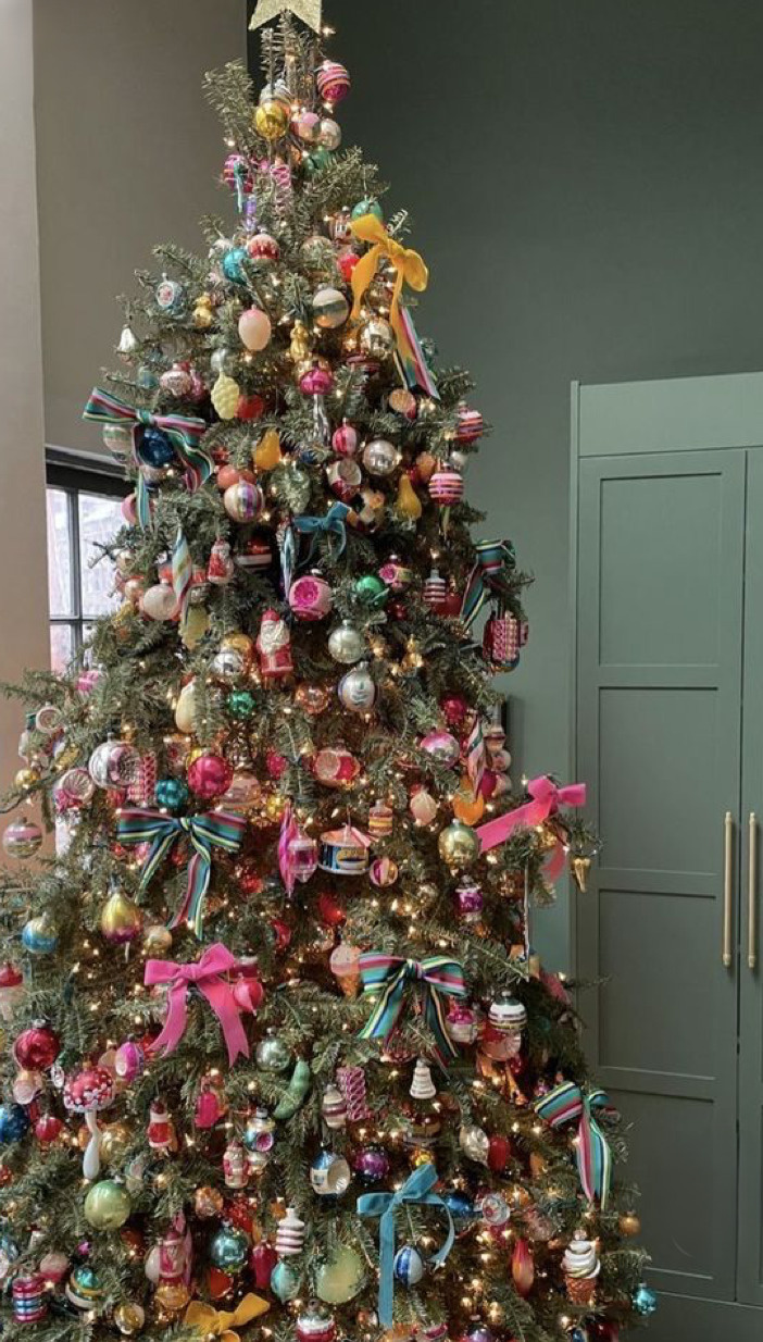 写真のように、色とりどりの飾りやリボン、手作りの人形、星やボールがぎゅっと詰まった豪快なツリーが主流です。